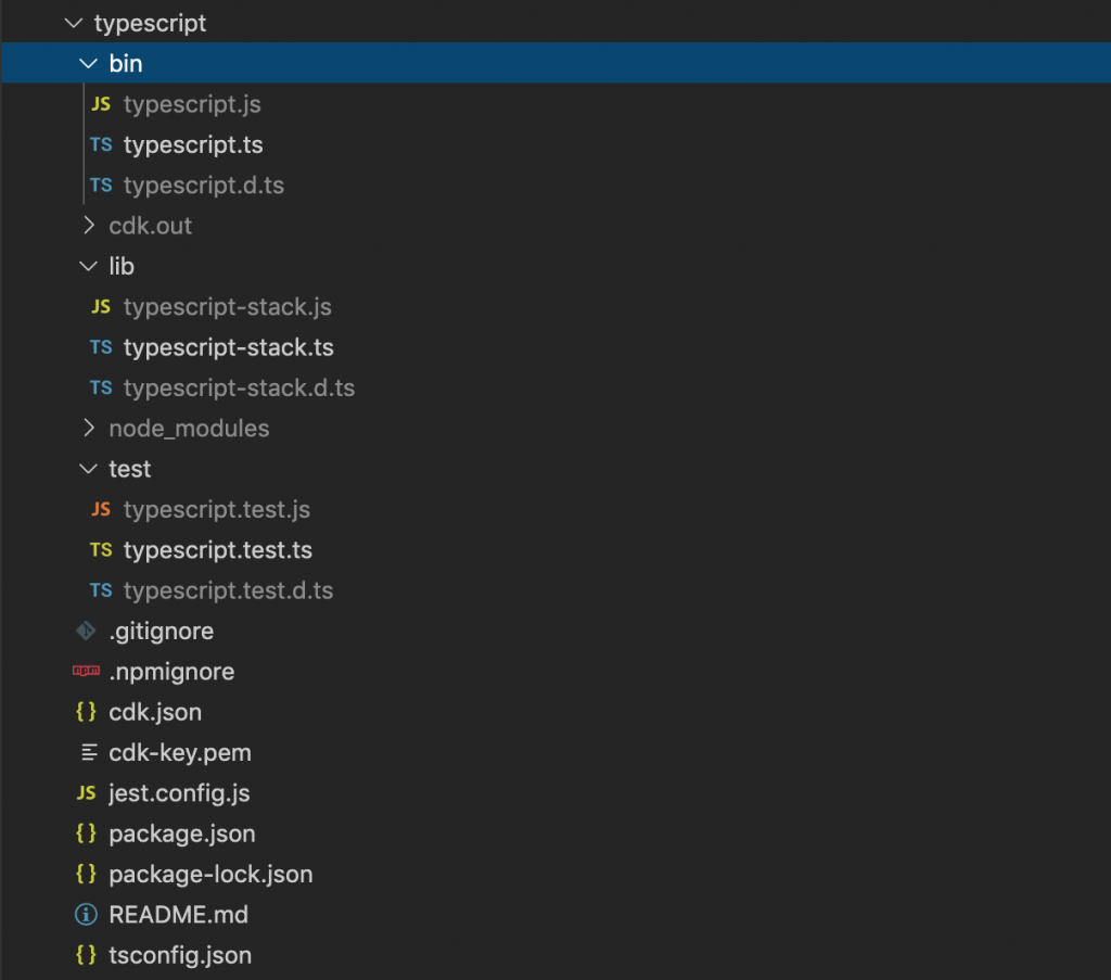 - lib is the directory where the infrastructure stack is defined. typescript-stack.ts is the main stack file, where the components will be defined. This file will generate the javascript output typescript-stack.js by means of the transpiler.