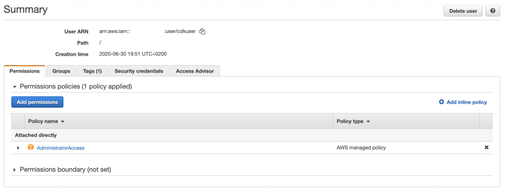 Keep in mind that the user which uses those credentials should have permissions to create the infrastructure specified in the code. For this example you can use the AdministratorAccess managed policy. Store well your credentials, and once this user is no longer needed, remove it, to avoid unnecessary risks.