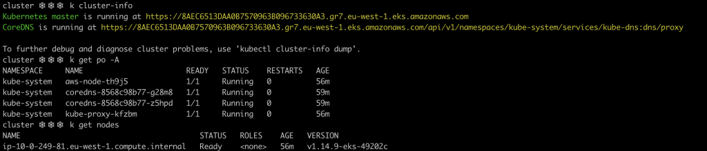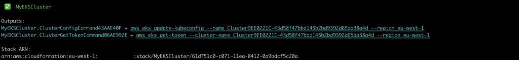 Once the cluster has been created, the CDK CLI will prompt the command needed to generate a kubeconfig to access the cluster.