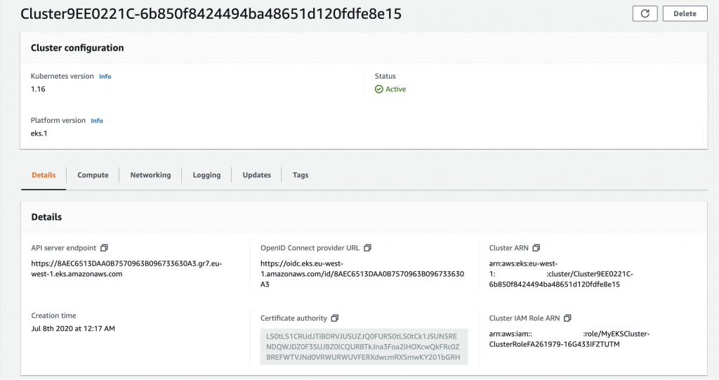 By following the previous steps, the stack can be created on our AWS account. In this case, we will be invoking the typescript compiler manually. Be patient as deploying the cluster may take a while.