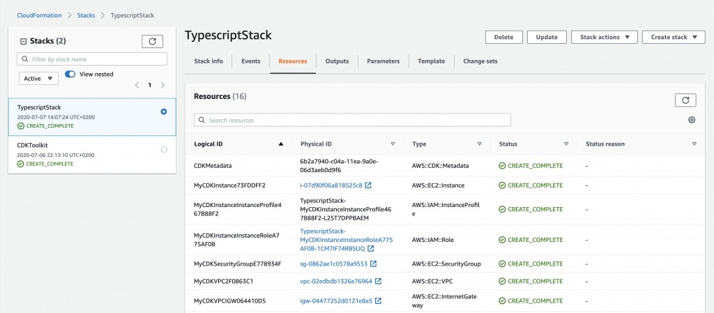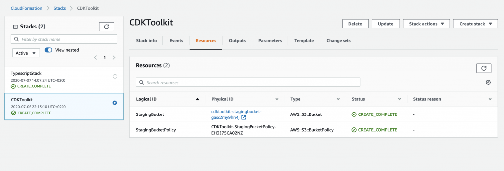 If you inspect the CloudFormation stacks in your account once the deployment has succeeded, you will see the different resources created by AWS CDK.