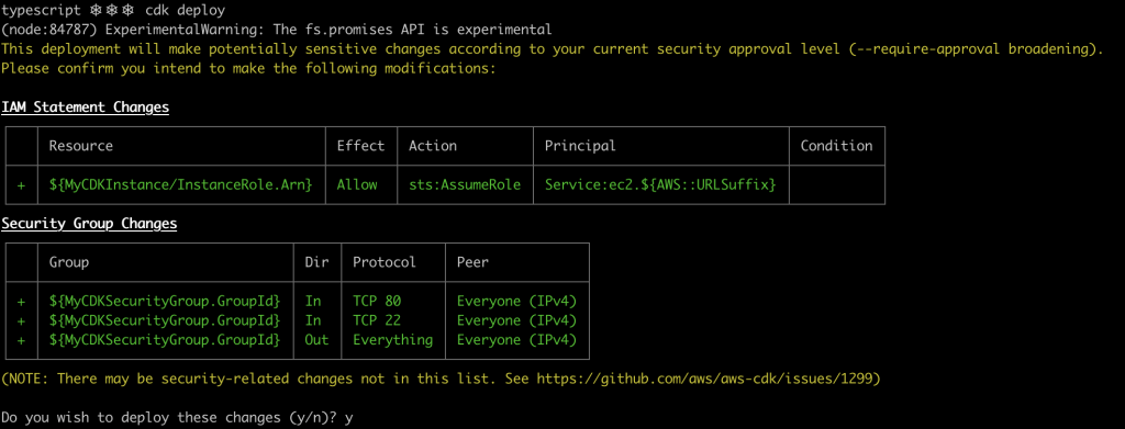 Once the bootstrap procedure is over, everything will be ready to deploy the stack. Issue the following command, and the resources to be created will be prompted, asking for your confirmation. If everything looks good to you confirm your deployment.