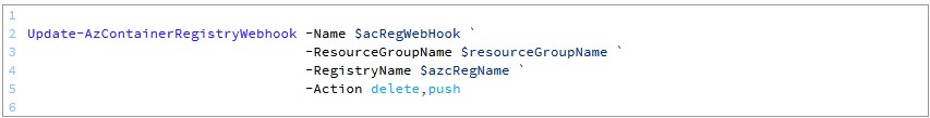 If you want to make changes to the webhook configuration, you should use the Update-AzContainerRegistryWebhook cmdlet with the following syntax.