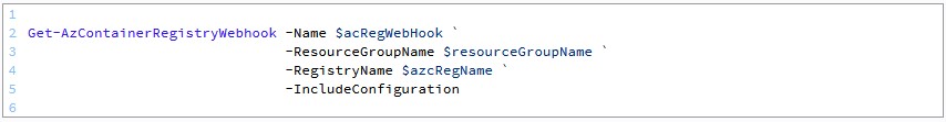 To verify the settings established in the previous step, use the Get-AzContainerRegistryWebhook cmdlet with the following syntax.