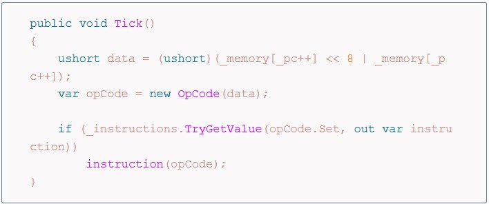 At this point, once we have read the ROM file into the _memory array, we can start processing the opcodes: