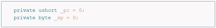 In addition to those, we also need two more fields to track the Program Counter and the current Stack position: