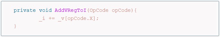 So, for, example the 0xFX1E instruction, which simply adds the content of the memory at location VX to the I register, simply translates into this: