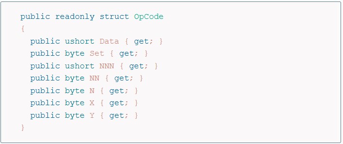 There’s a nice table on that Wikipedia article with the entire list so I’m not going to replicate it here. In order to emulate these opcodes, I am using a struct to represent its data