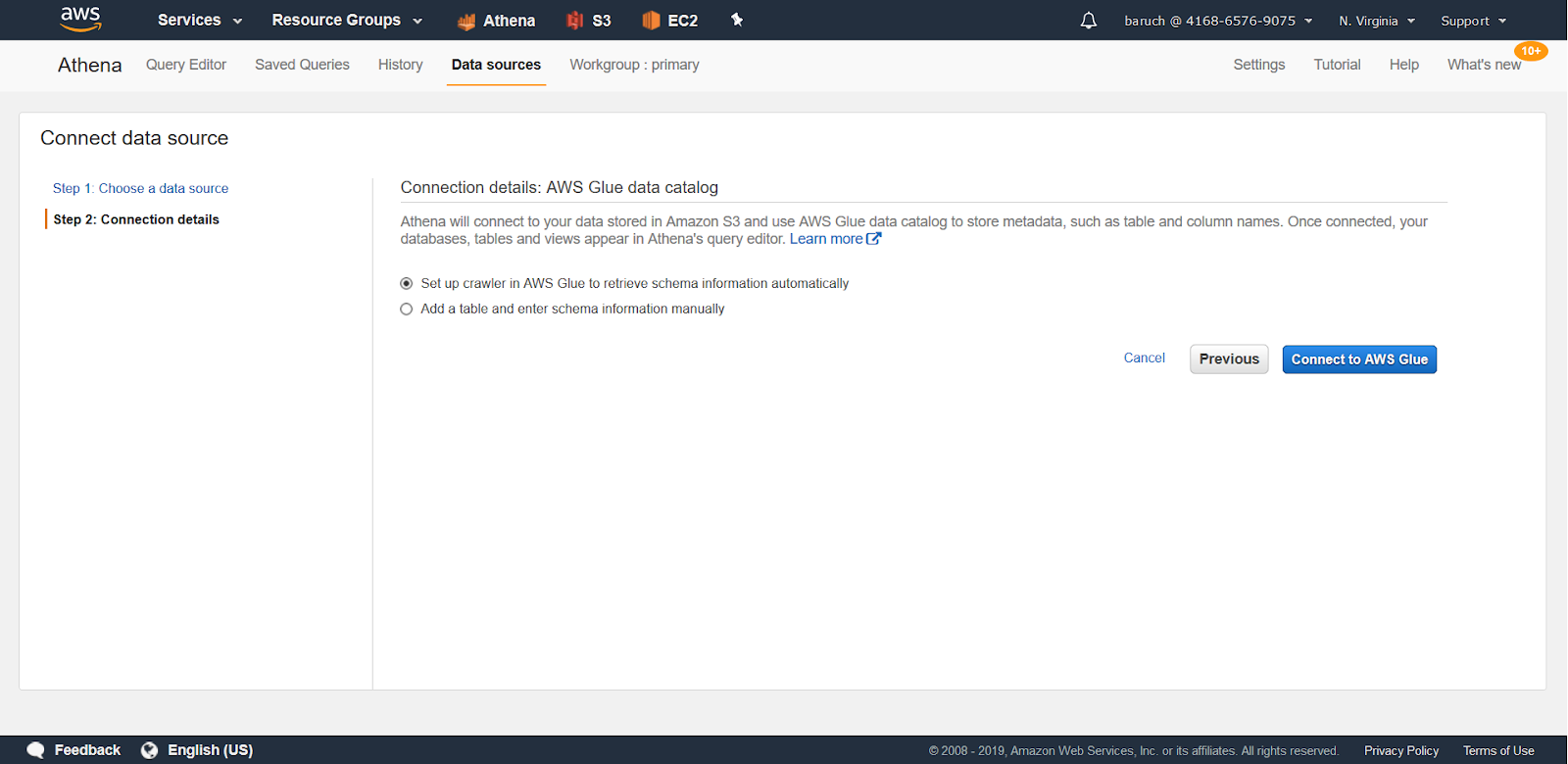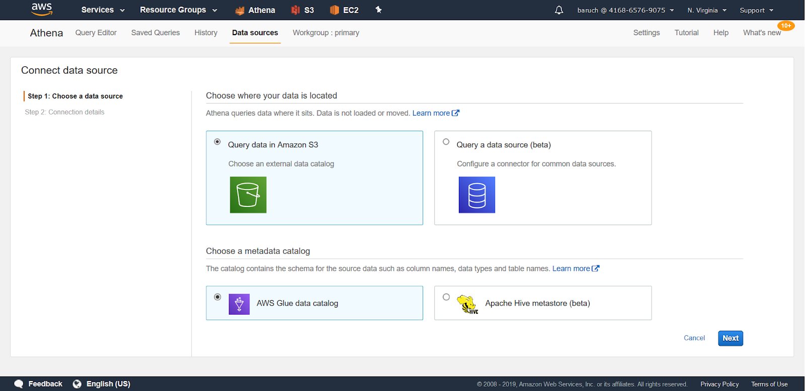 - Check the “Query data in Amazon S3”, “AWS Glue data catalog”