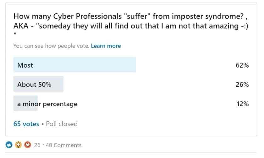 I created a survey on Linkedin surrounding Impostor Syndrome in Cyber Security, and it looks like a lot of us “suffer” from it, particularly when it comes to the cyber management level. (link to the survey here)