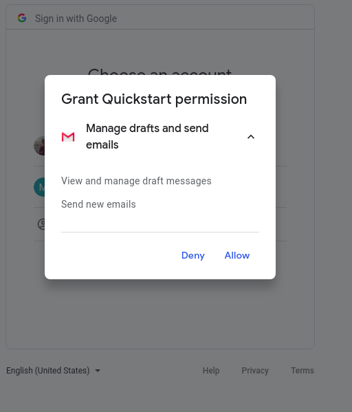 After the request has been sent, Google pops up a windows in which I have to log into my account, and consent to the application to send emails on my behalf.