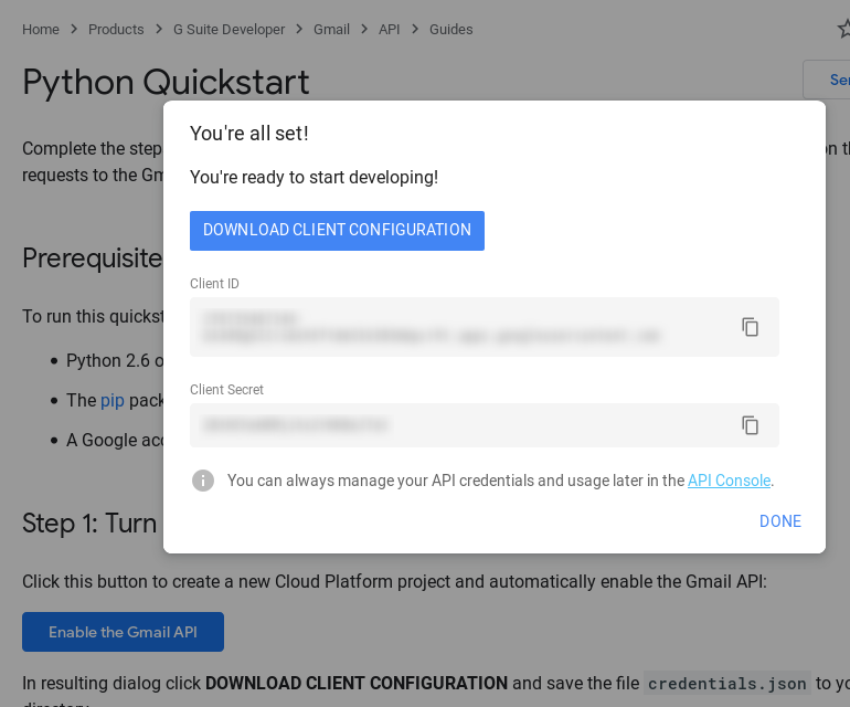 When you start using Gmail’s API you need to register your application to Gmail. After you enable the API, Google will provide a Client ID and a Client Secret for your application.