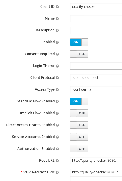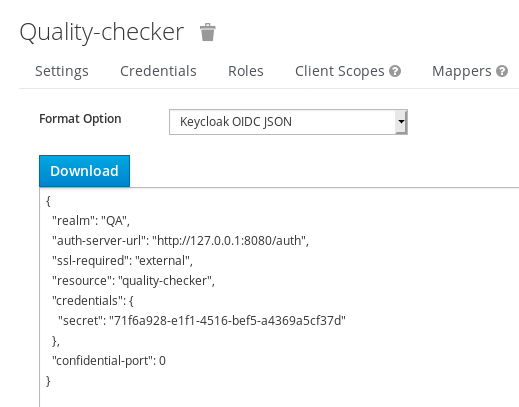 When inspecting the “quality-checker” client, I will be able to find information like, the client ID and client secret which will be used by the application, the scopes that are configured for the application, and even valid redirect URIs.