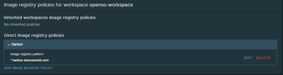 In this example, you can see the configuration of an image registry policy that allows the user to pull images only from harbor.tanzuworld.com and not from docker.io, to avoid vulnerabilities and apply these policies to a cluster group.