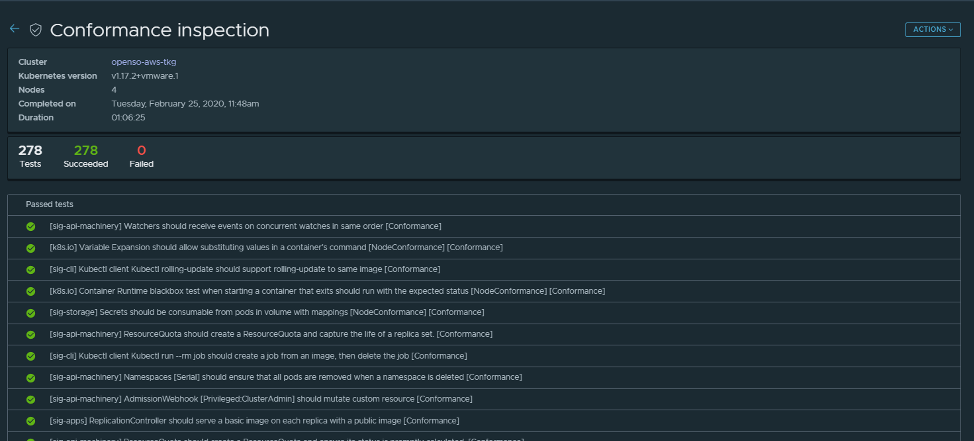 As you can see, there are 278 different parameters being checked as part of the conformance check. These conformance tests are the best practices generated by the open-source community. You can customize your own, according to organization policies leveraging the Sonubuoy open-source project plugins.