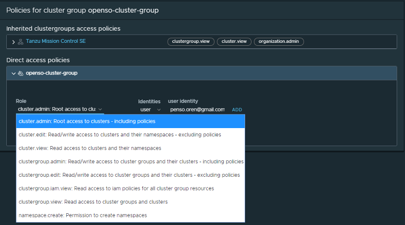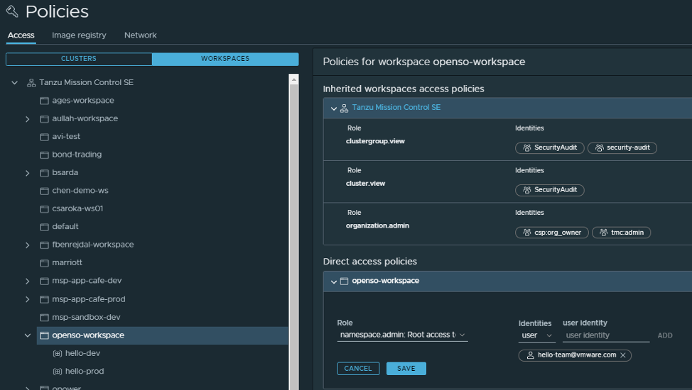 Managing Identity and access across many clusters is a hard task. With Tanzu Mission Control, we can operate this aspect in aggregate, and reduce complexity and increase security of the entire Kubernetes environment. We can see the permission hierarchy for a cluster group and change the direct access policy on a group of clusters; this allows us to grant various DevOps teams access to the clusters they need without them needing to go to each cluster separately.