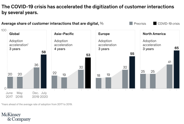 According to McKinsey, in most regions of the world, the digitalization of businesses was accelerated on average by three years. The average share of digital customer interactions increased to 58% by July 2020 from 36% at the start of the covid-19 crisis.