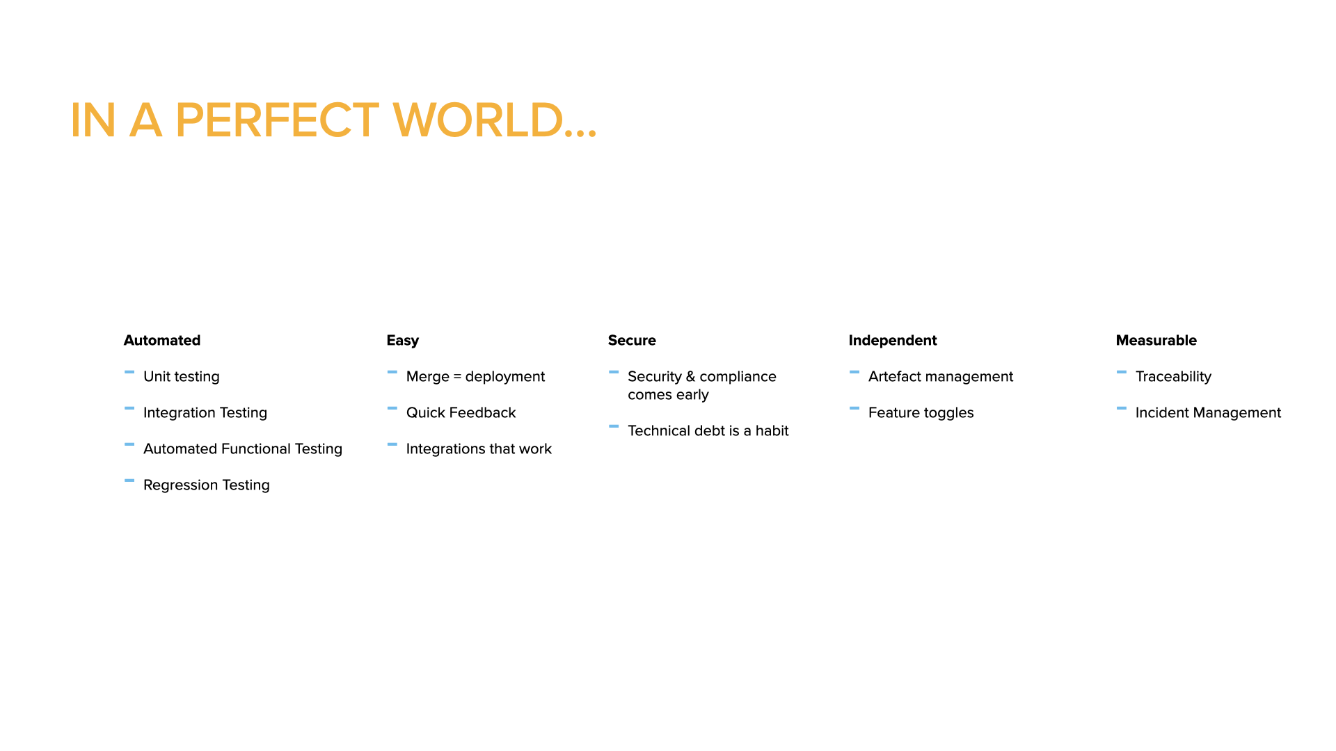 In a perfect world, everything would be automated, easy, secure, independent and data-driven. Testing of any kind would be an easy habit; merging code would happen confidently. A security review wouldn’t be an afterthought, but it would shift left and not happen in isolation. Releases would be frequent and fast, and getting something live would be a code commit and be as simple as turning on a feature toggle. Finally, our work would be traceable, and incidents would be easy to pinpoint because we would have the tools to see precisely where the failure is. And all this would be supported with dashboards, tools and APIs that the team would use and necessarily service requests to a remote operations team.