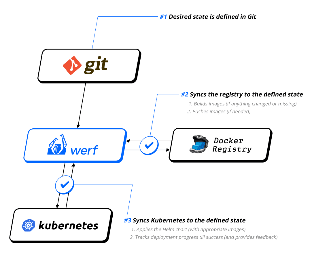 Werf is an open source GitOps tool which aims to speed up application delivery by automating and simplifying the complete application life-cycle. To do so, Werf builds and publishes images, deploys applications to Kubernetes clusters, and removes unused images based on policies and rules defined in the Git repository.