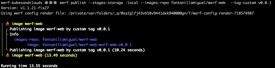 TIP: If you prefer using a local Docker repository, rather than using Dockerhub, you can just run the following command, and specify –images-repo localhost:5000/your-repo-name when issuing the werf publish command.