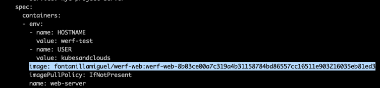Notice how the go template functions werf_container_image and werf_container_env are used in the deployment manifest. These functions are evaluated when rendering the chart and generate the keys image and imagePullPolicy based on the tagging strategy, and the environment variable DOCKER_IMAGE_ID, respectively.