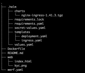 Werf expects files to be organized following a specific structure within the code repository. The image below shows the structure of the example repository that we will be using for this post, which contains a simple webpage (in /web) that is packaged in a nginx Docker image, and deployed to a Kubernetes cluster using Helm.