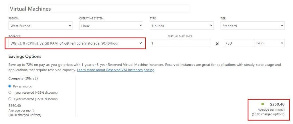 After deciding on the specific type of the VM you need, you go to the pricing calculator, and see how much this machine is going to cost you.